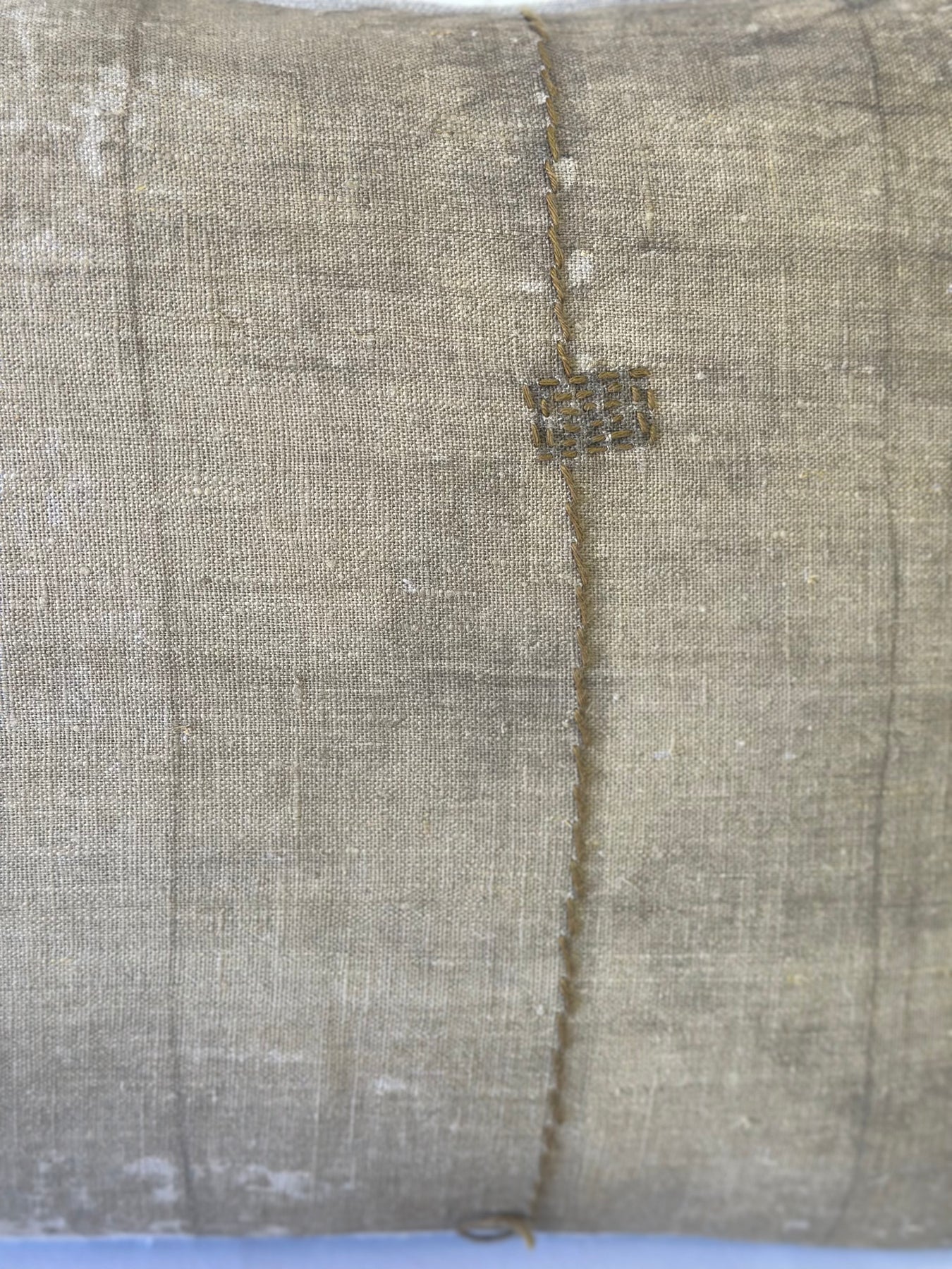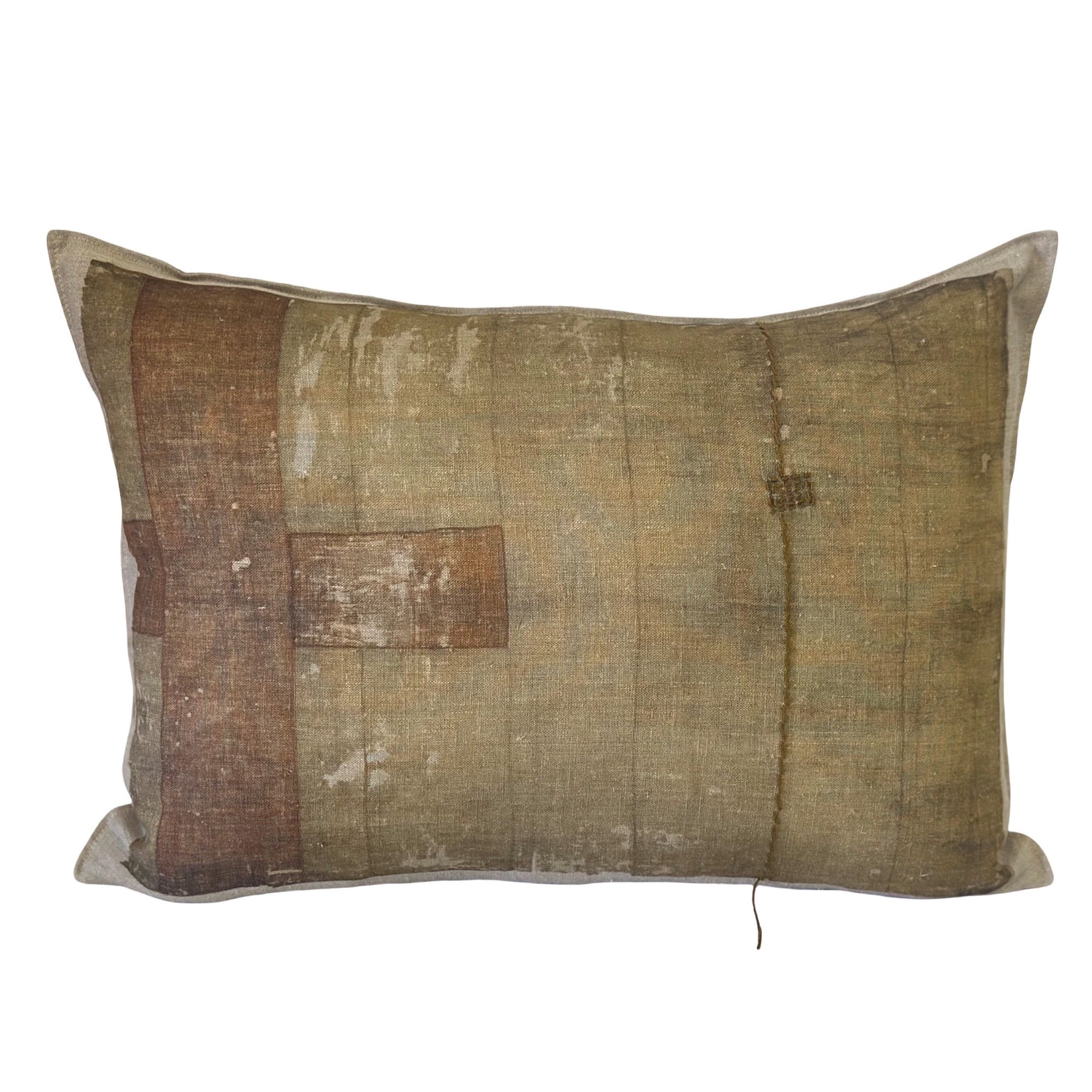 Pure linen, front printed with a faded image of an old, distressed piece of fabric.  Plain back.  Our signature custom made antique brass zipper exposed.