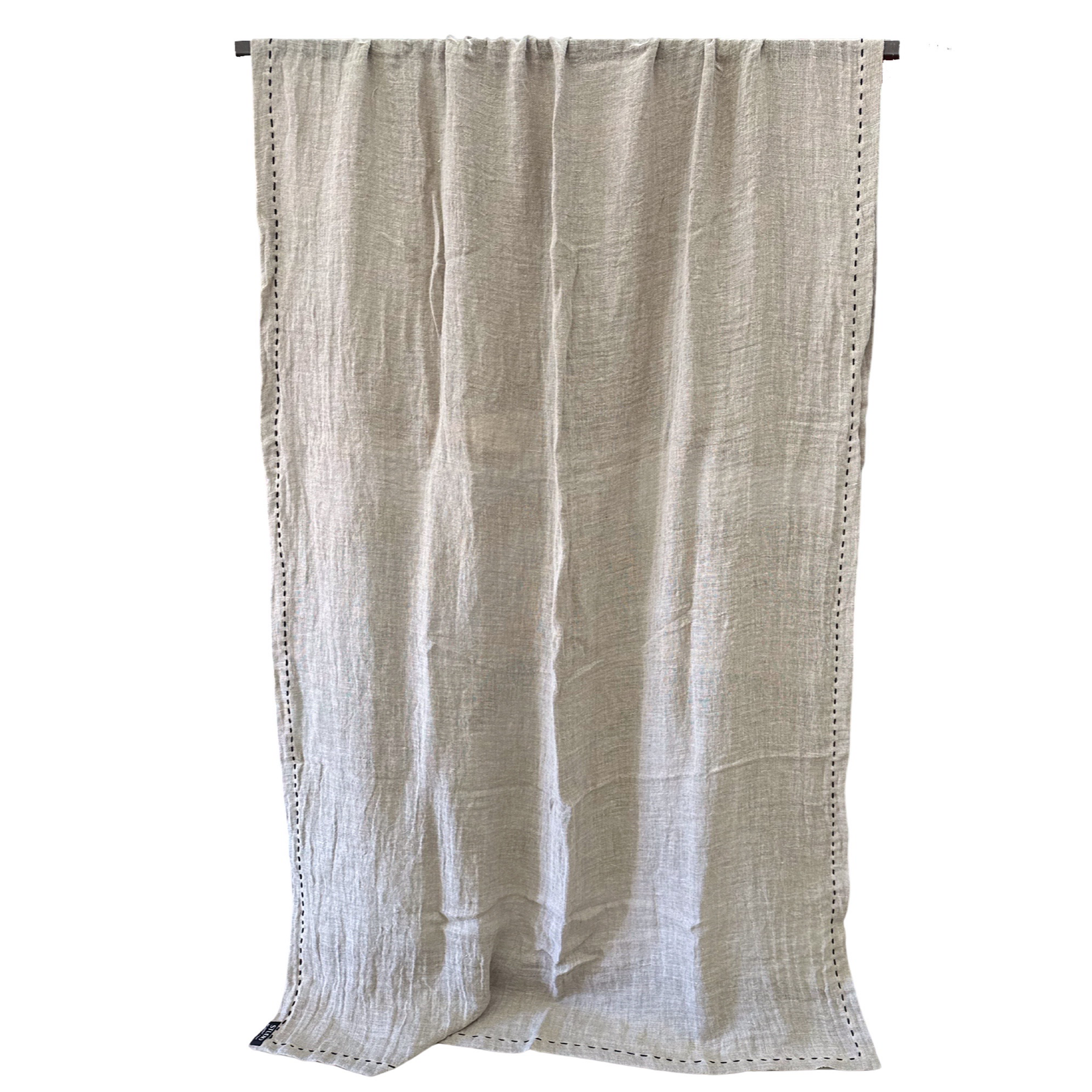 Details:  Pure linen natural loose weave sheer. Soft washed with hand stitching using black thread on the hems.